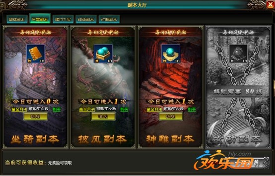 副本大厅中的副本分为四种,日常副本,横扫千军,经验副本,红颜副本